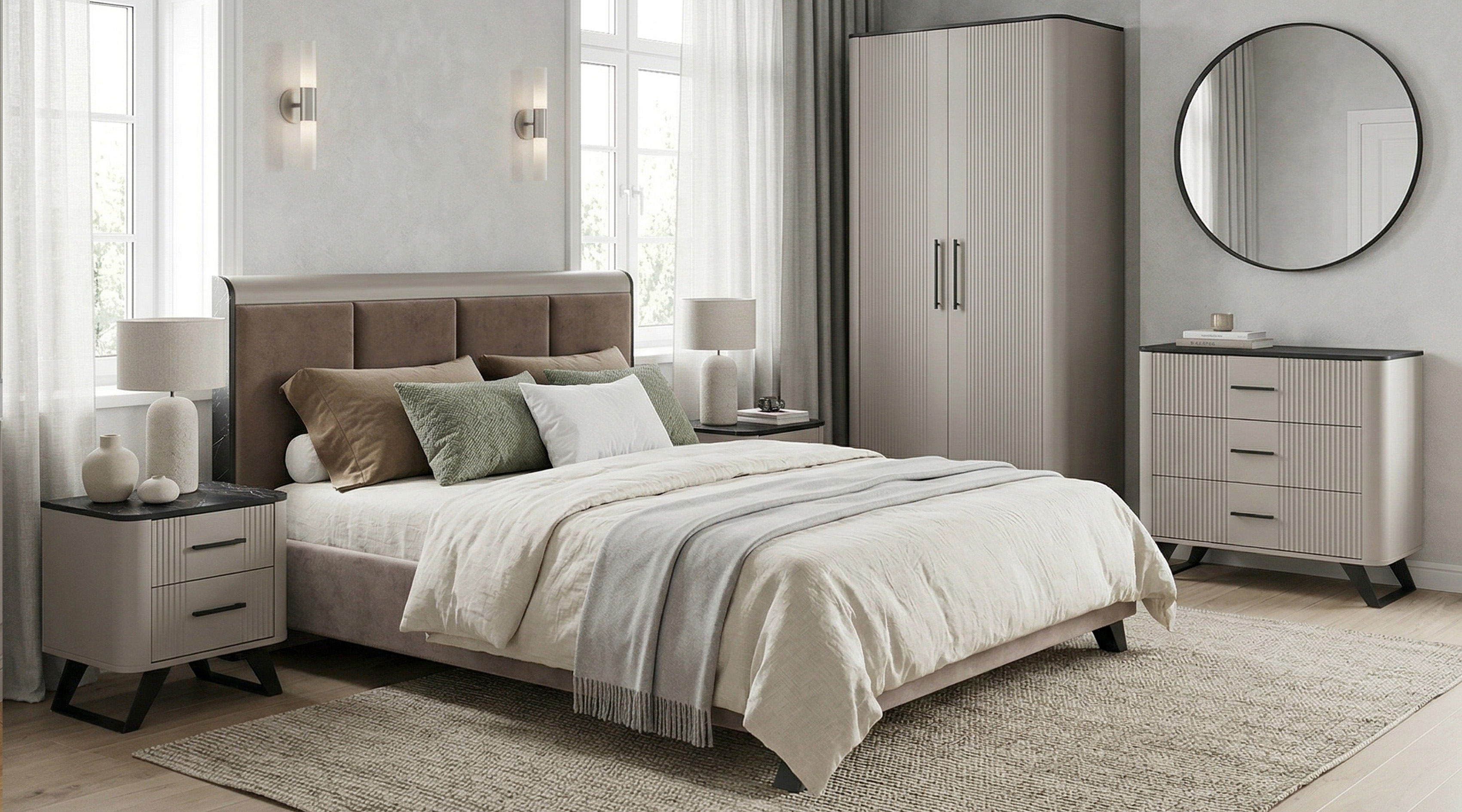 Модульная серия Сицилия КОМОД БОЛЬШОЙ 1844 (Ш) х 400 (Г) х 910 (В) мм. Корпус ЛДСП цвет Кашемир + тёмный мрамор Фасады МДФ цвет Кашемир с фрезеровкойШариковые направляющиеОпо..