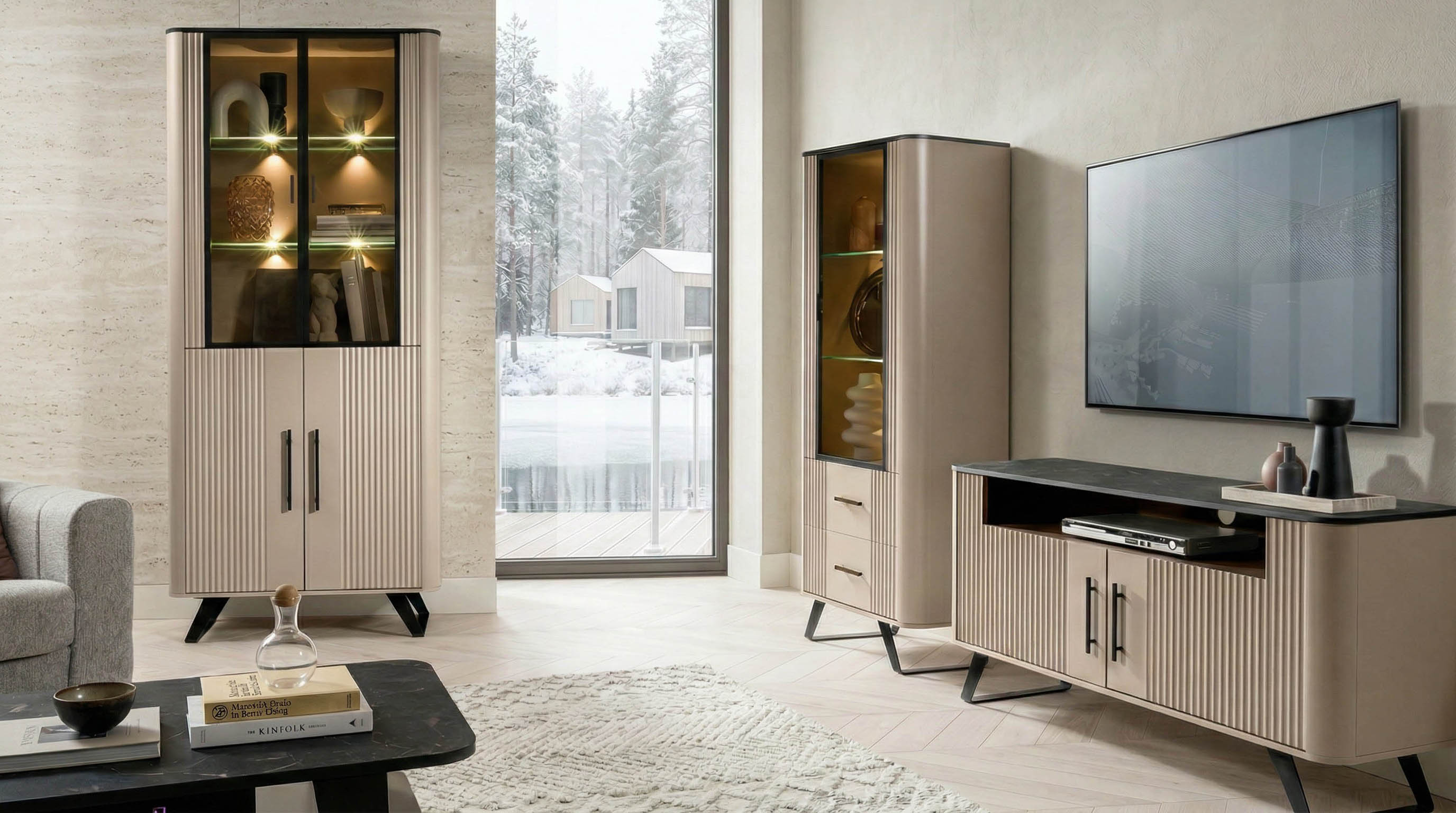 Модульная серия Сицилия ТВ-ТУМБА 1844 (Ш) х 400 (Г) х 650 (В) мм. Корпус ЛДСП цвет Кашемир + тёмный мрамор Фасады МДФ цвет Кашемир с фрезеровкойШариковые направляющиеОпоры ме..